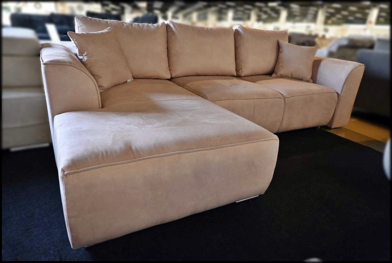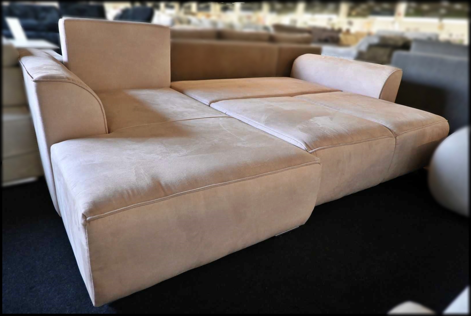 Eckgarnitur in Samtoptik graubeige – komfortables Sofa mit Federkern, Bettfunktion, Stauraum und 5 Kissen.