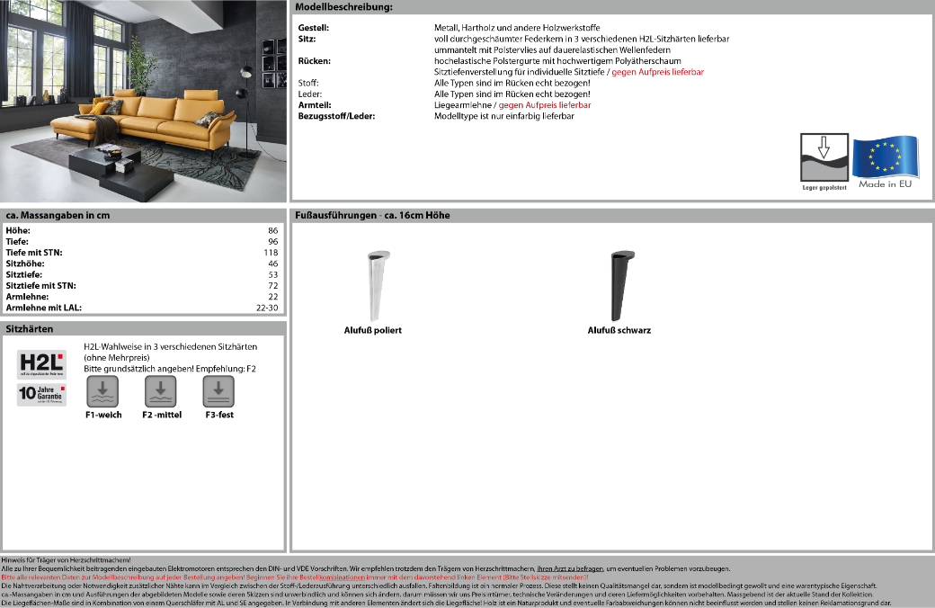 Der Rücken ist mit hochelastischen Polstergurten und hochwertigem Polyätherschaum ausgestattet, was für angenehme Unterstützung sorgt. Optional ist eine Liegearmlehne (LAL) erhältlich, die zusätzliche Relaxmöglichkeiten bietet.
