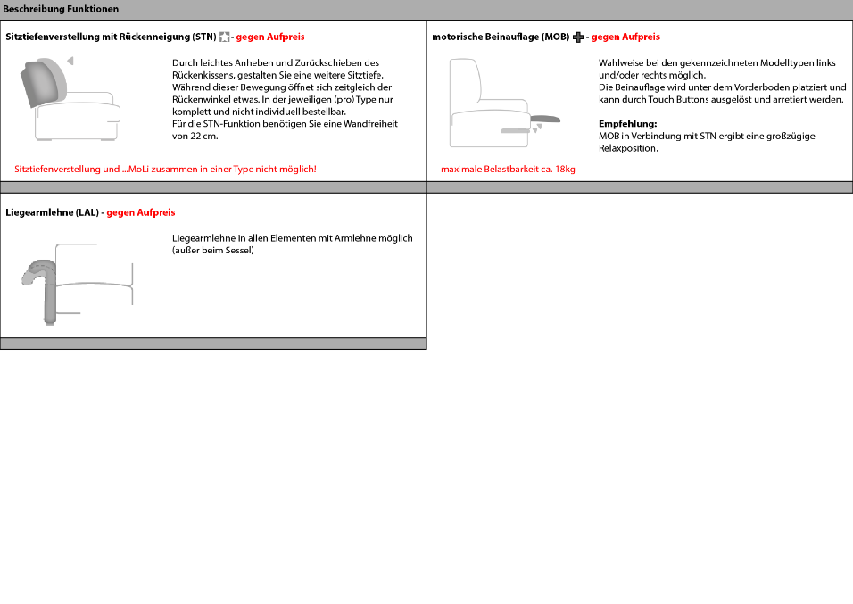 - Motorische Beinauflage (MOB): Über Touch-Buttons steuerbar, aus dem Vorderboden ausklappbar, belastbar bis 18 kg. In Verbindung mit der STN entsteht eine großzügige Relaxposition.