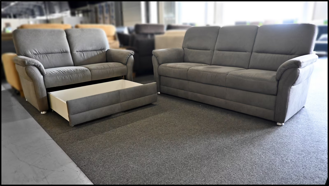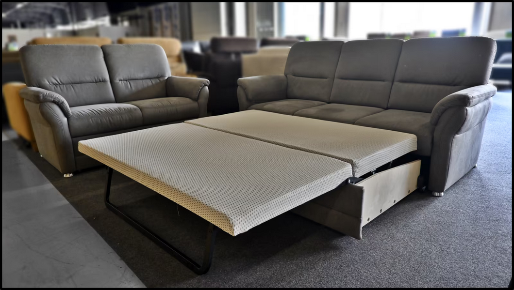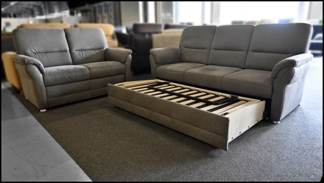 Polipol PP-QL11014 Q+ Sofa-Set kombiniert modernes Design mit hohem Komfort und praktischen Funktionen. Das Set umfasst ein 3er Sofa mit Bettfunktion und Lattenrost für entspannte Nächte sowie ein 2er Sofa mit integriertem Stauraum.